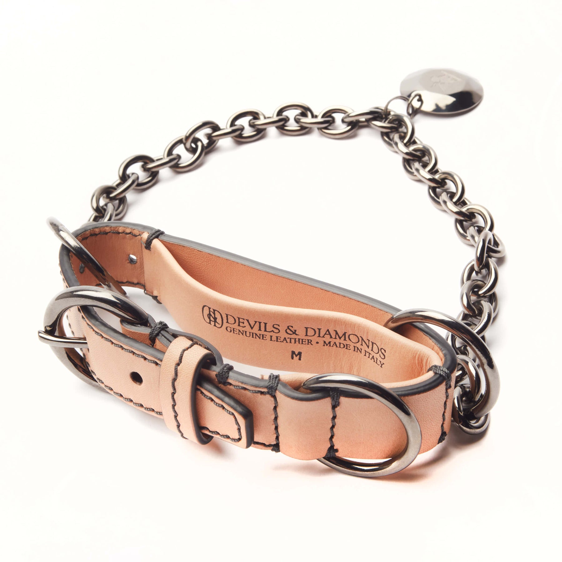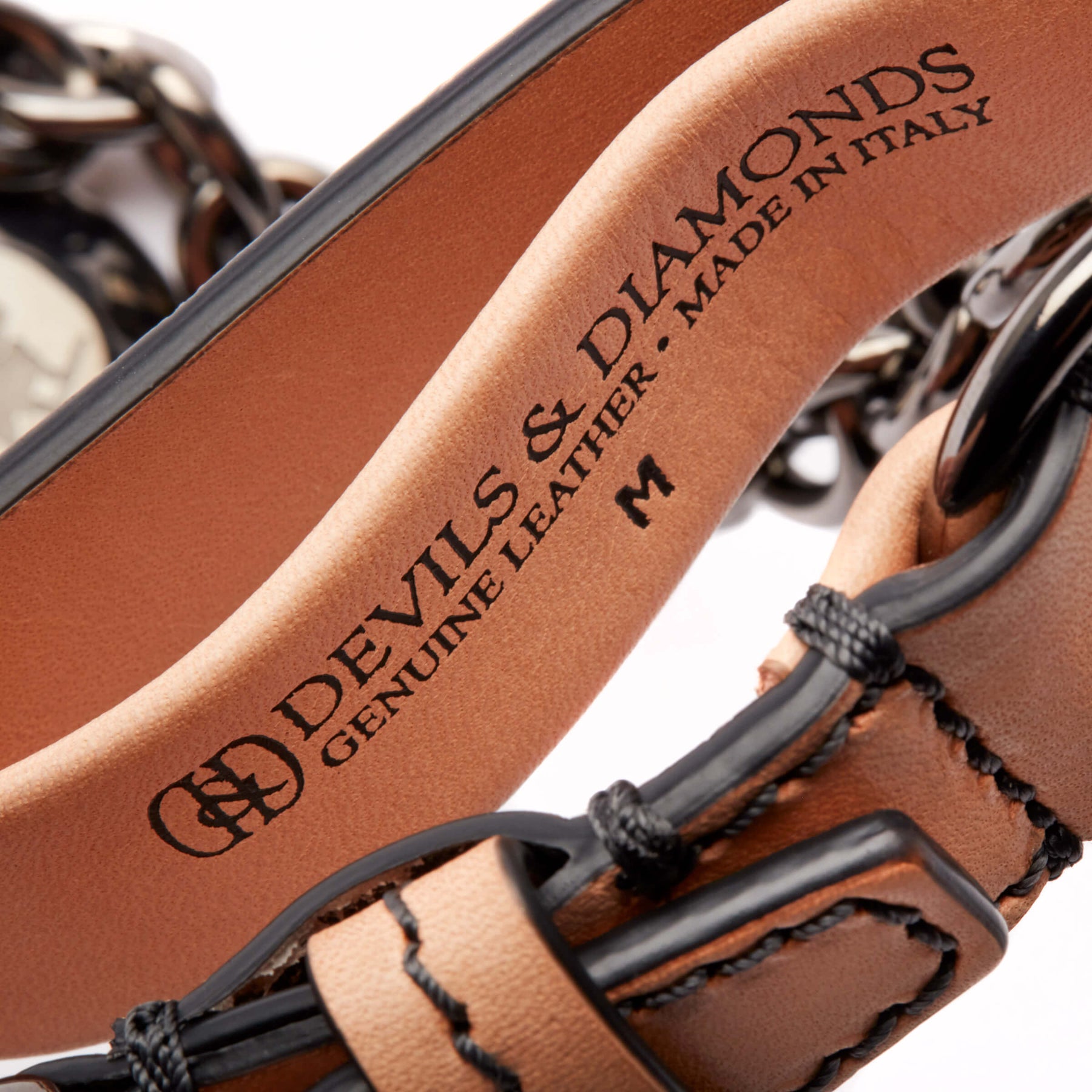 A statement piece crafted from Italian kidskin, this collar features a signature chain link choker with Devils & Diamonds hardware. It’s the epitome of urban sophistication.